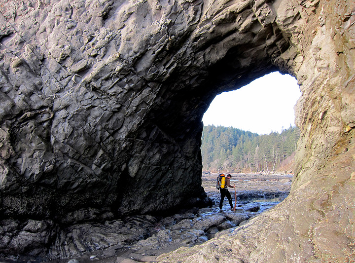 Slippery walking as we pass through a natural arch near the north end of Rialto Beach. |
