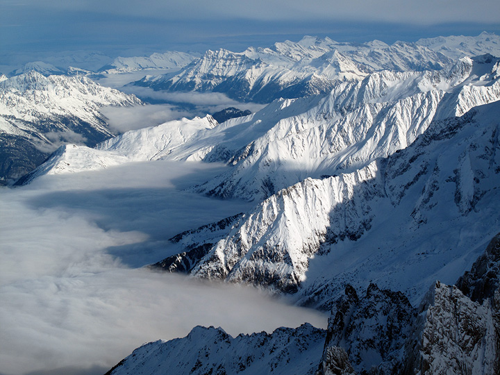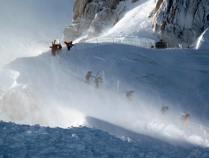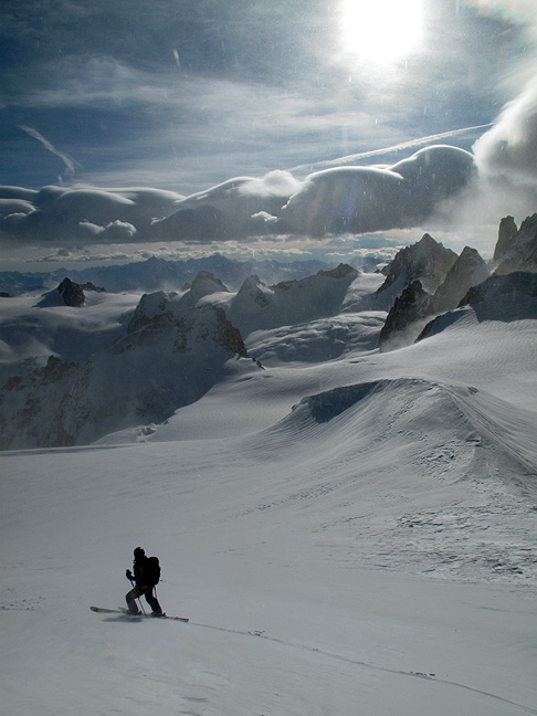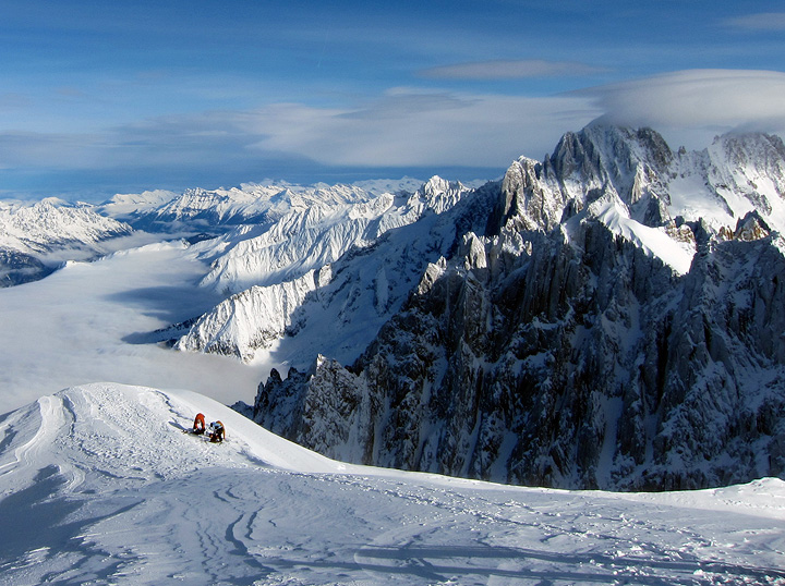 The last couple days have been pretty moist down in the Chamonix Valley. But a quick look at the Aiguille du Midi webcam suggested that the weather aloft was not bad at all (though the webcam does a poor job at showing wind). So up we went. |