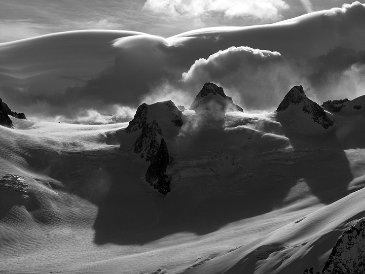 The frontier ridge, as well as Mont Blanc remain under threatening lenticulars all day. |