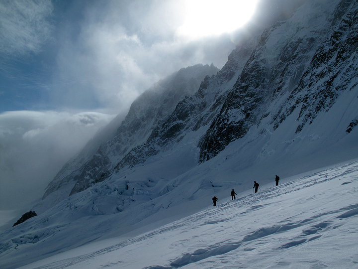 We began our week with some off-piste skiing down the Argentière Glacier and other forays from the Grands Montets. The new snow was wind-blown but quite good skiing. |
