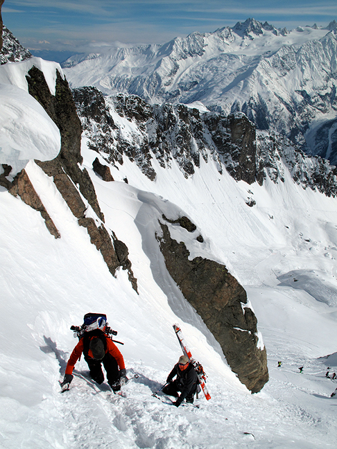 Skins stripped, clicked in, and ready to head down the back side of beyond, into the head of the Combe de la Balme. |