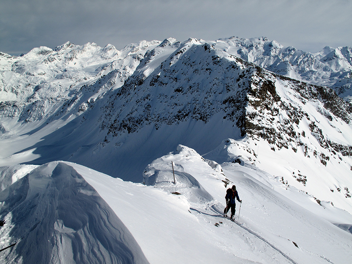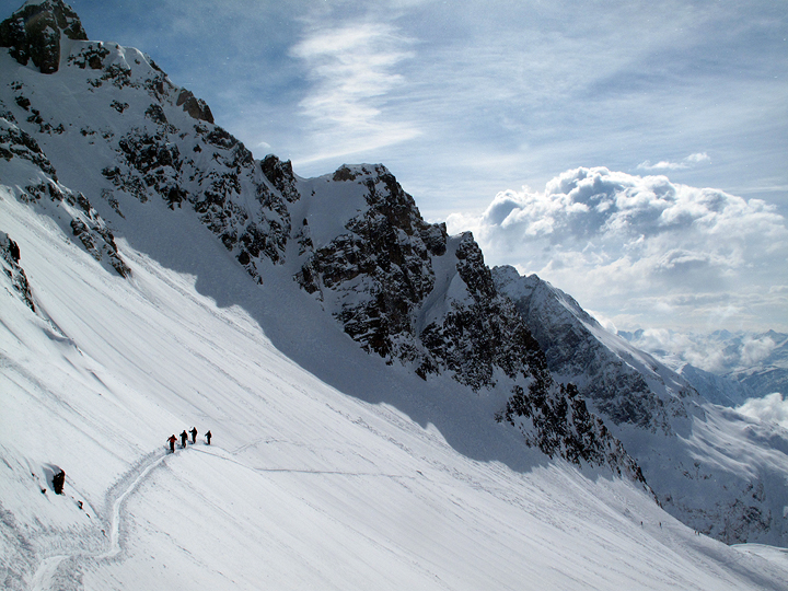 For our last day we took in some new (to us) territory in the back country of the Italian ski resort of La Thuile. We skied up the Pic Valaisanne, 2892 meters. Approaching the summit ridge here. |