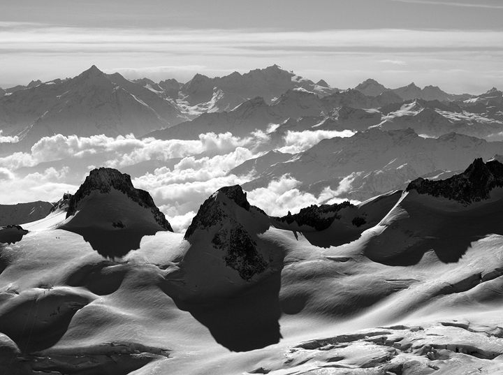 Peeking over the tops of Pointe Helbronner and the Aiguille du Toule into Italy, innocent cotton clouds lend a touch of interest to the view. |