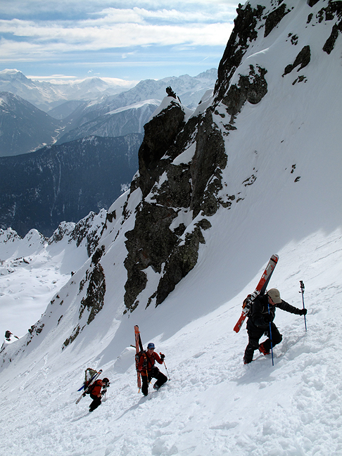 Booting up the steep gully to the Col des Aiguilles Crochues. |