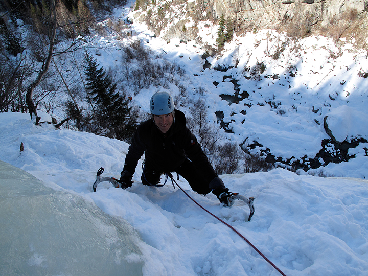 A blustery, windy day up high made us opt for ice climbing on our 5th day together. Rich tops out on one of the lines at the Crémerie. |