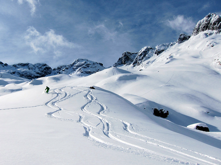 Again soft, sweet snow awaits on another north facing descent into the Combe de la Golette, down to the Lac de Salanfe. |