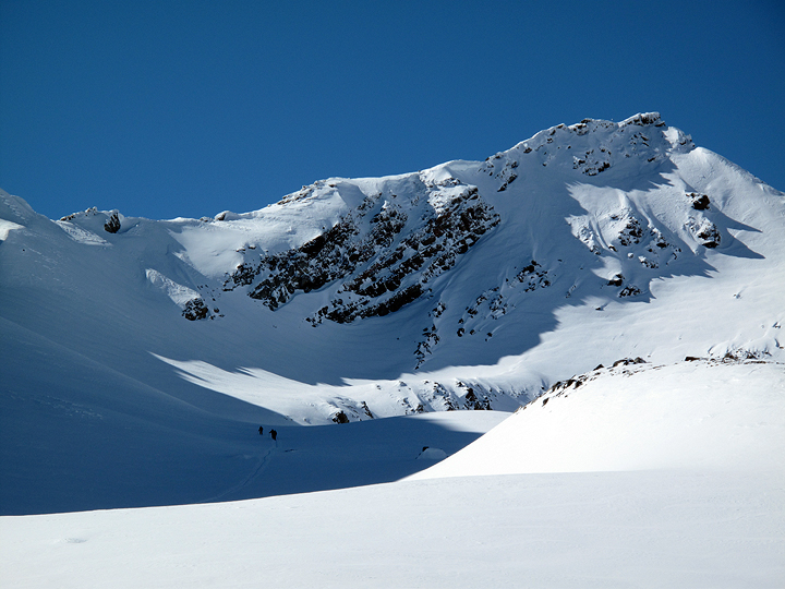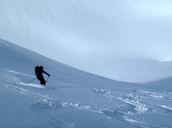 Though windblown on the ridge crest, the north-east facing bowl held good snow for our descent. |