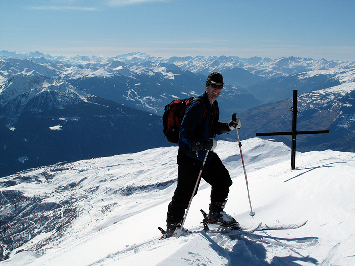 Dan tops out, with the distant pistes of Les Trois Vallées in the background. |