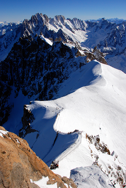 In the background are the Grandes Jorasses (far left), its ridge extending westwards to end at the spike of the Dent du Géant. The smaller peaks along that same ridgeline are Pointe Helbronner, the Grand Flambeau, the Aiguille de Toule, and the Aiguille d'Entreves. |