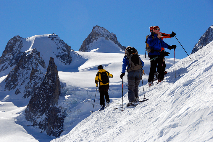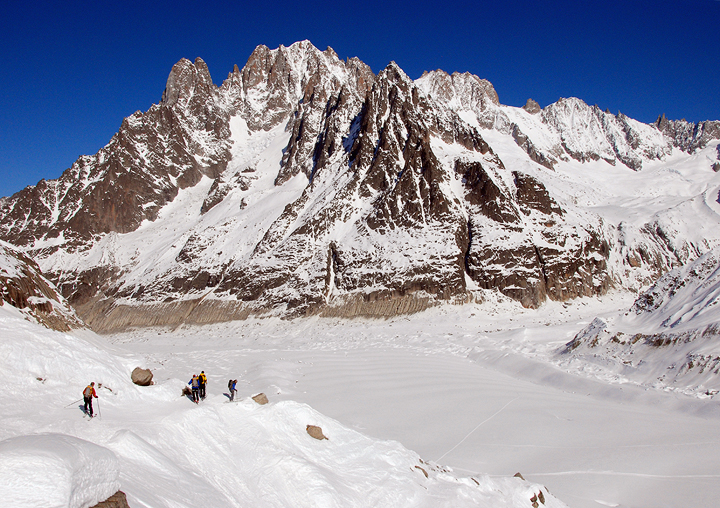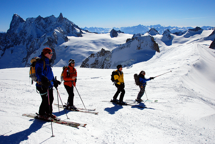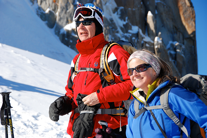 Jerry Minzel and his friend Rick Billingham of the Seattle area joined us in 2007 on a Chamonix to Zermatt Haute Route. This year they came over again, this time with Jerry's son Jeff, and all of their wives (Vicki, Judy and Lori, respectively) for a week of on and off-piste skiing. They hired Kathy (and Mark of course joined in as "official" photographer) for a descent of the Vallee Blanche. |