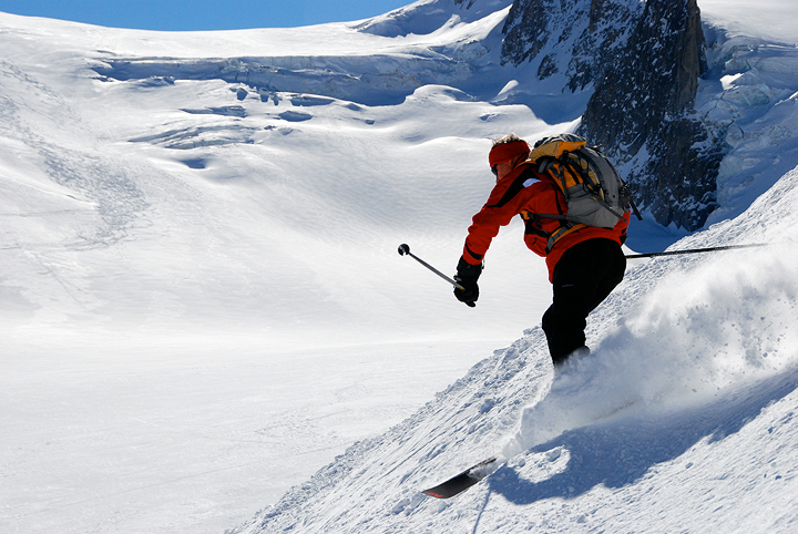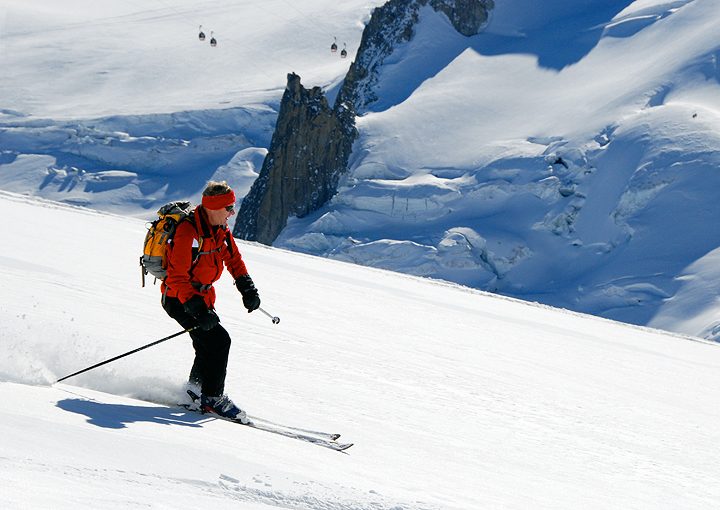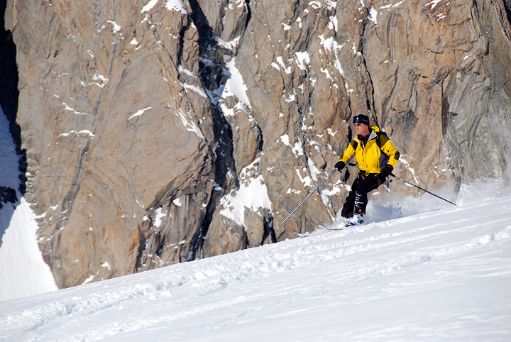 Jerry shows the "crud" who's boss. Actually the snow was pretty nice, though choppy. Tracks in the background are from skiers descending from the Italian side, from Pointe Helbronner. |