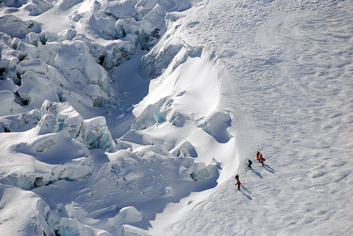 Another group escapes the crevassed section below the "Salle à Manger", and begins the low-angle glide down what Kathy calls the "moving walk-way" section of the Mer de Glace. |