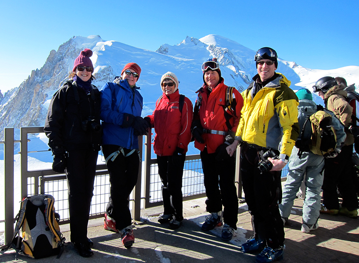 Judy, Rick, Vicki, Jerry and Jeff, taking in the sunshine and the views on the summit of the Aiguille du Midi. |