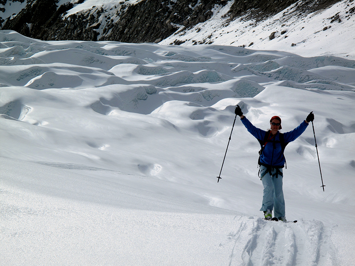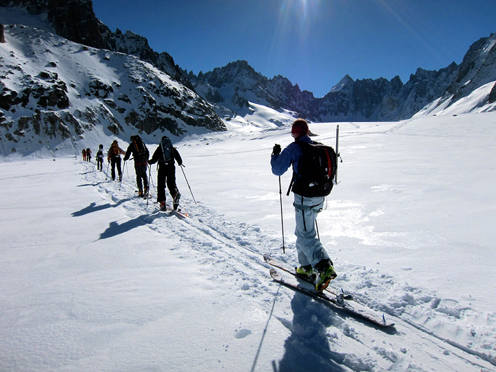 Our first day, proper, of the Chamonix—Zermatt. Here, we have just skied down from the Grands Montets and are now cruising across the Glacier d'Argentière. |