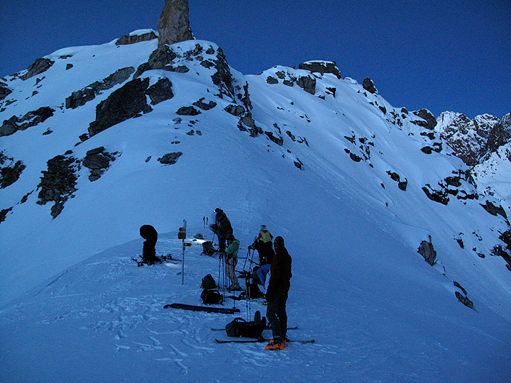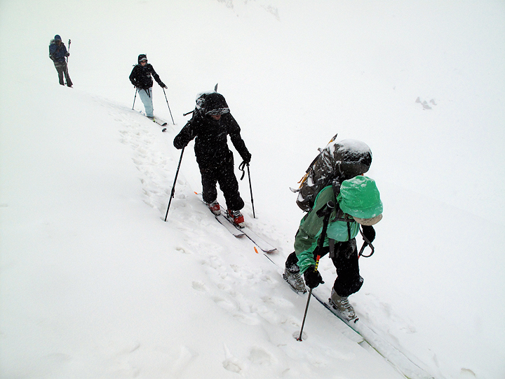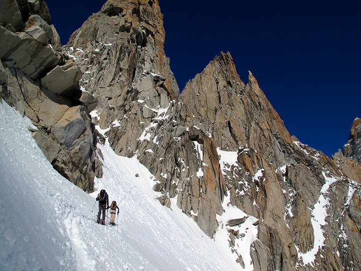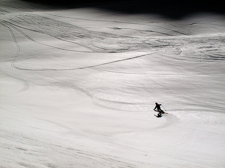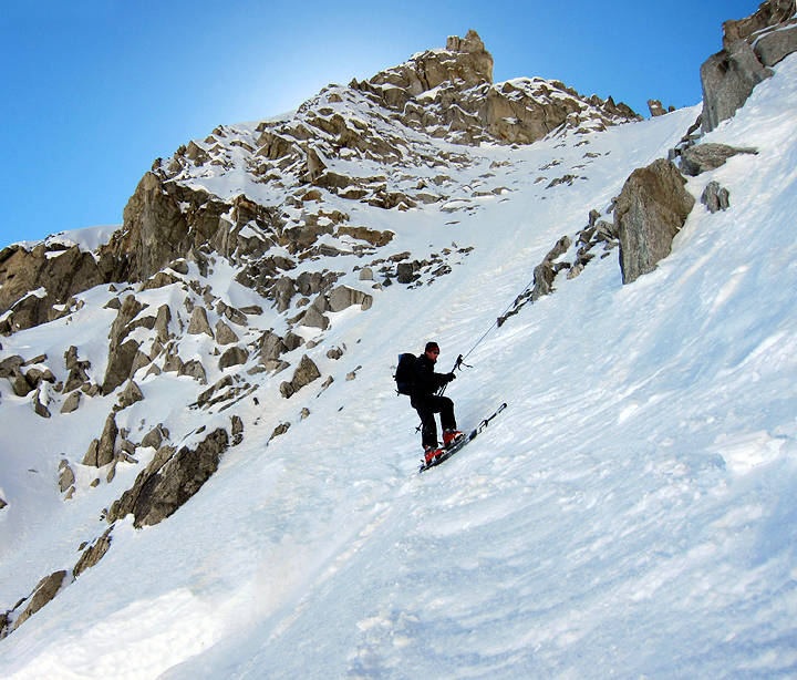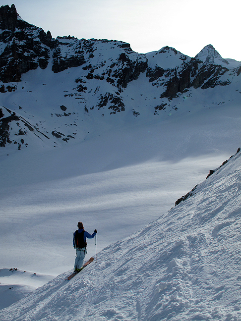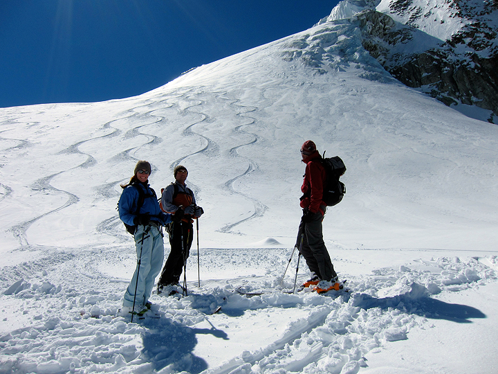 After climbing up to the Col du Chardonnet, we have a steep technical descent. This quite impressive side-slip is some 80 meters long and about 45 to 50 degrees. We invariably do this with the aid of a belay rope. |