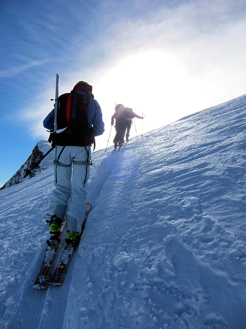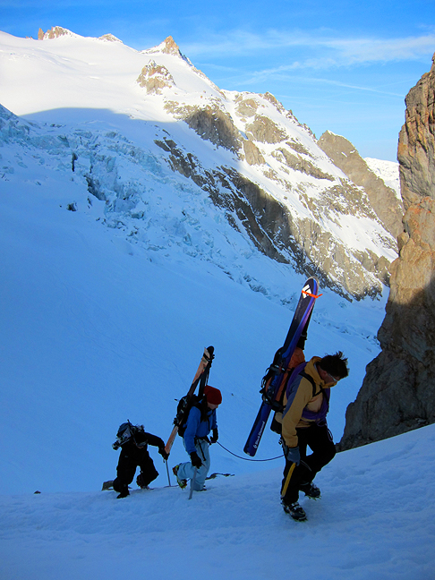 Day 2 starts with a quick (and rather icy) descent from the hut, and then a bit of steep booting up to the Col des Ecandies. Here, Patrick, Joy and Mark are about to arrive at the Col. The Aiguille du Tour in the sun behind. |