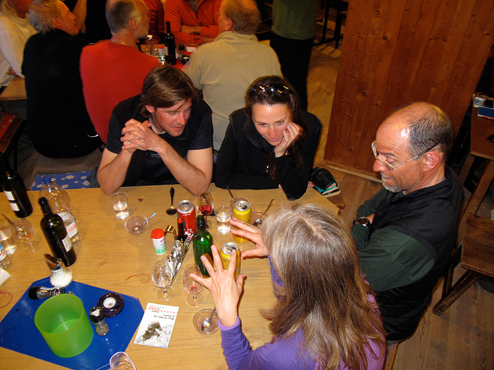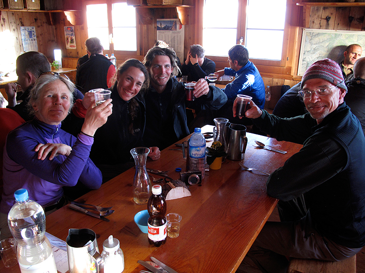 Our first Chamonix to Zermatt Haute Route of the season included Joy and Patrick Kettler, Thomas Kral, as well as (of course) Kathy and Mark. The Kettlers have home-like connections to Verbier, London and Austin, Texas. Thomas is a bit more settled down, calling Ottawa, Ontario his home. We were a bit concerned about conditions this season, as the snowpack has been rather lacking. However, it seems that up high, on the glaciers in particular (where we spend the vast majority of this tour) there is plenty of snow. And, in general, conditions were great. As has been common this winter, we had lots of sun. All but one of our 8 days of skiing were sunny. The downside of all this fine weather (besides the Farmer John tan) was a lack of nice powder snow. But we did have some good corn, and, for the most part, fun skiing.