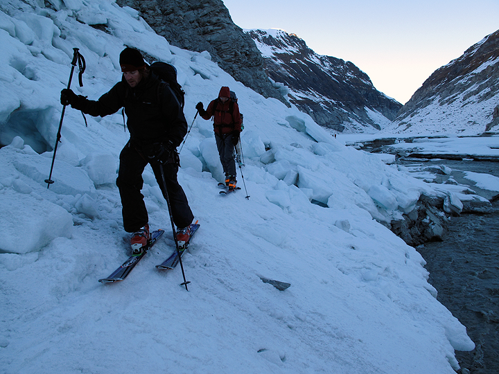 Even though we had nice and cold conditions, the thin snow "encouraged" us to descend all the way to Lac Dix before continuing up-valley. Normally, we try to stay high on the slopes. While the low route was completely feasible, there were a few interesting sections where bluffs and cliffs pinched us between the rock and the river in the valley bottom. The traverse along Lac Dix always is rather interesting, and usually includes skiing over some strange ice blocks along the lake edge. Lac Dix is a large dammed reservoir. The lake is filled in the summer months, and is drained for electricity generation in the winter. During the winter months, the lake level drops precipitously, leaving slabs of once-lake-level ice stranded high on the banks. Navigating down through the ice is often an "amusing" affair. |