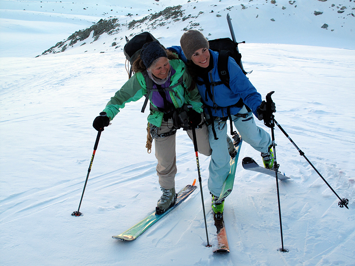 After the Col, a short descent on ski leads to another climb up and over the Fenêtre de Saleina. Kathy and Thomas skin up to the base of the couloir. In a few meters they will put skis on packs and boot up to the top. |