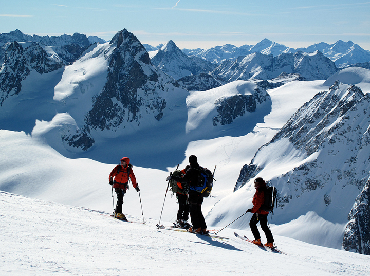 The high point of this tour at 3790 meters, is the summit of the Pigne d'Arolla. The view to the SE and up towards the Col de l'Evêque (above the head of the right-most skier), the first pass on our last day is clearly visible. |