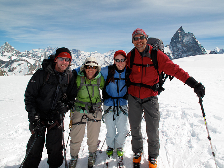 Left to right we have Patrick, Kathy, Joy, Thomas, and the Matterhorn. This photo was taken at the Col de Valpelline. |