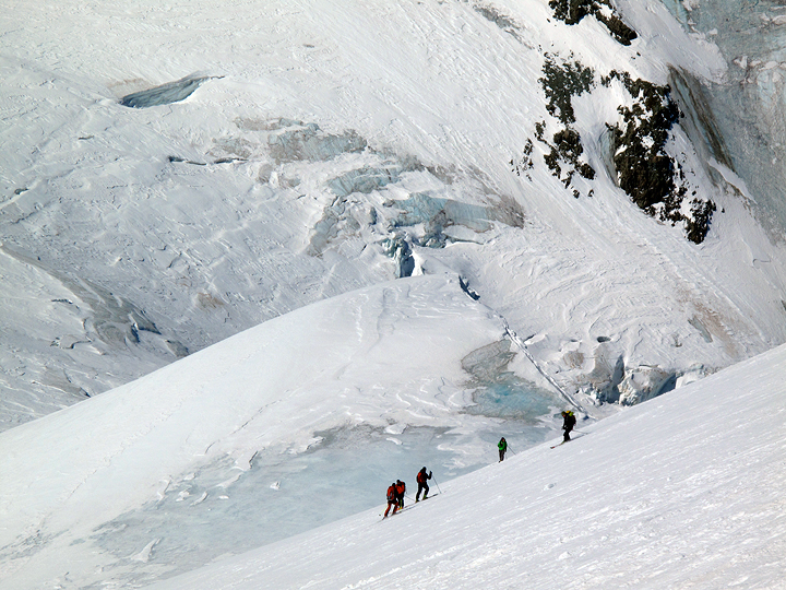 Another party skiing down the Breithorn. The slope is fairly steep. |