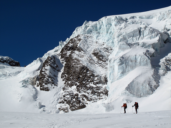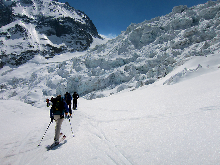 Skiers pass below an active icefall high on the route. |