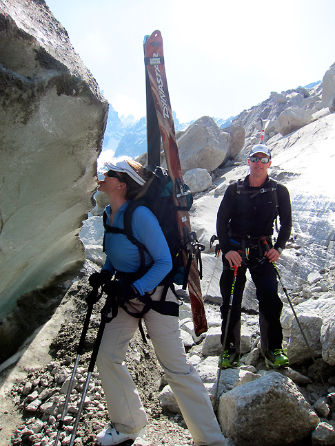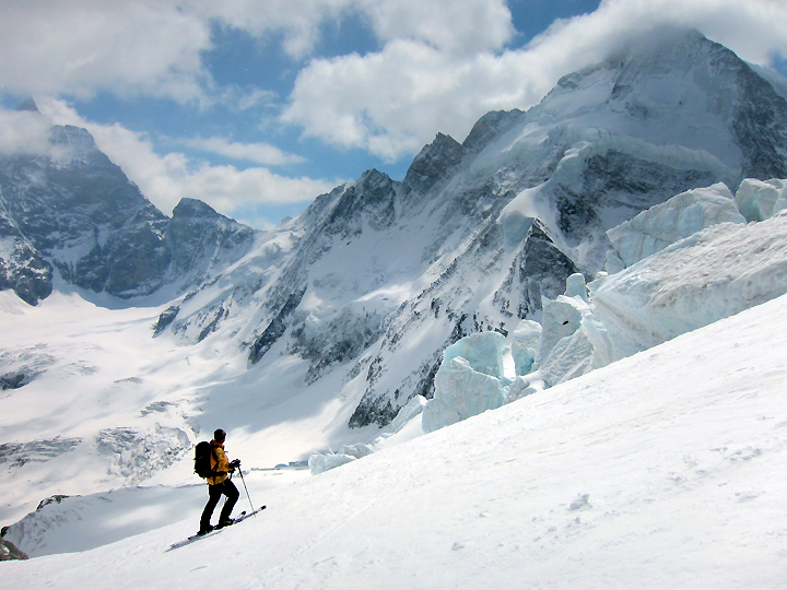 But all things come to an end. Here we ski down toward Zermatt past big blocky ice séracs on the Stockji Glacier. |