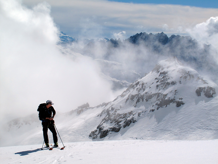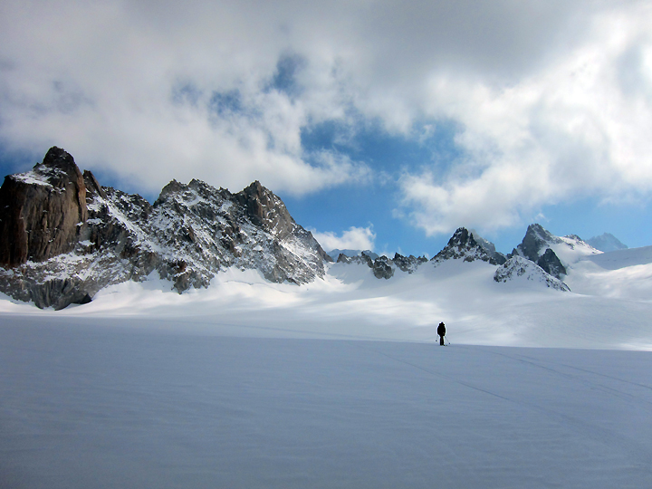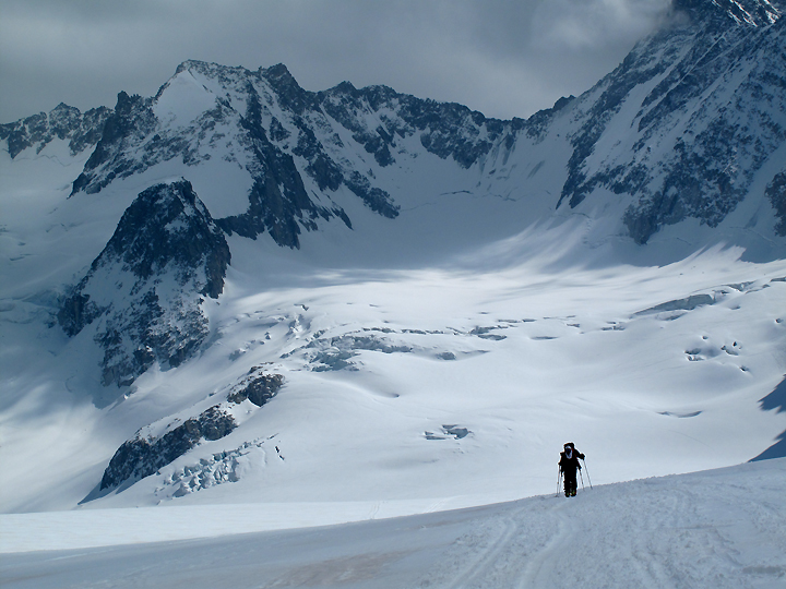 Amy enjoys a moment of solitude gliding along the glaciated Trient plateau. |