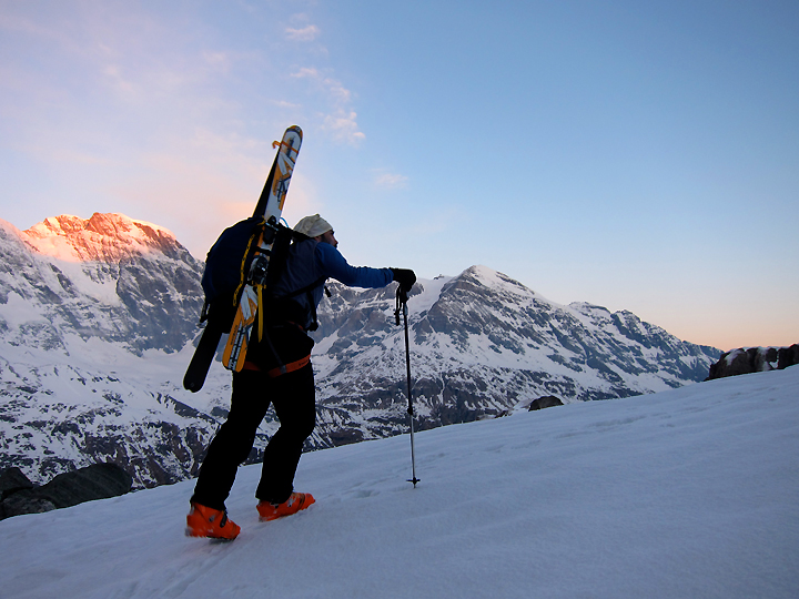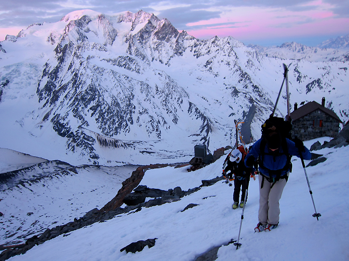 The next morning it's another early start to get up the Plateau du Couloir. We leave the hut behind in the pink morning light. |