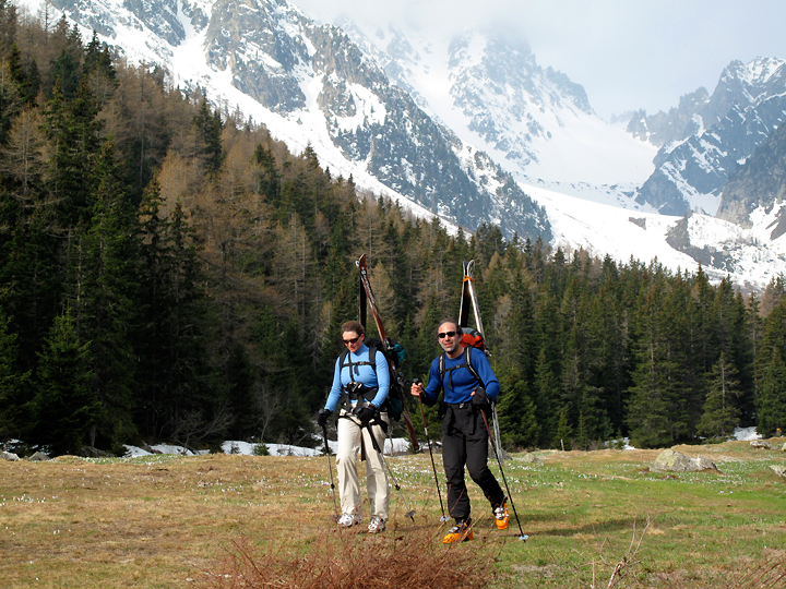 Walking the spring meadows for the last few minutes to the Relais d'Arpette to meet our vehicle for the transfer to Bourg St. Pierre. |
