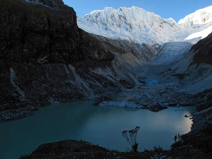 Here is the view looking up at Artesonraju from Moraine Camp. Though the weather was perfect, there were a number of other factors, all relating to risk, that compelled us to reconsider this objective. After spending the night at Moraine Camp, we reluctantly decided to head back down to base camp. |
