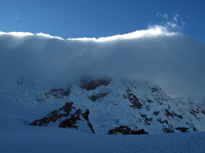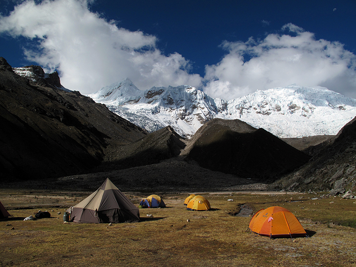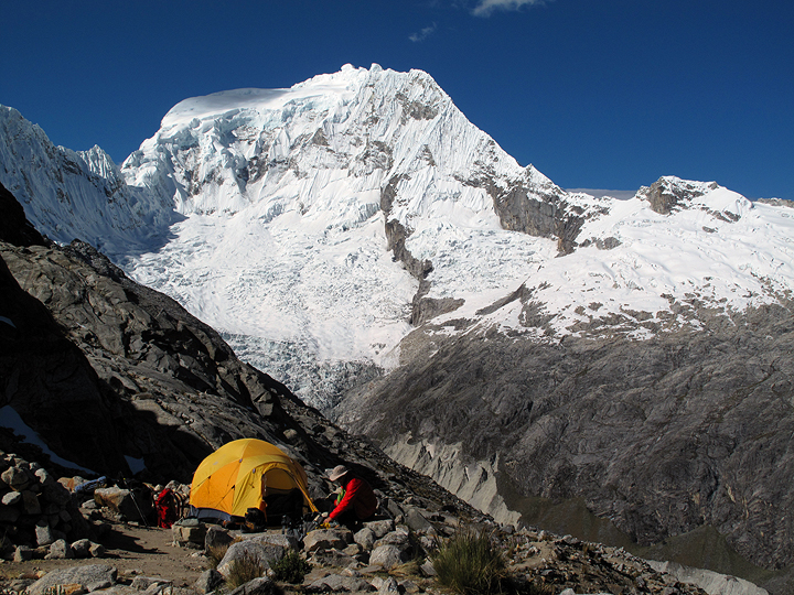 The following morning, we had another leisurely start, strolling up to high camp at about 4900 meters (16,100 feet). This view shows camp and Ranrapalca. |
