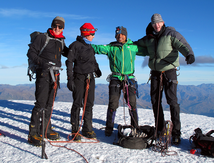 Peter, Lynne, Peter and Bill on the summit of Vallunaraju. Emery was not in this photo as he was acclimatizing in Cuzco with his wife Martha. But he did join us the following day. |