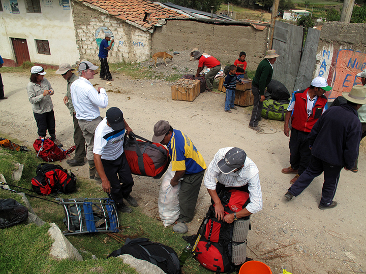 After a rest day in Huaraz, we drove to Cashapampa to begin our two-day trek into the base camp for Artesonraju. The scene at the road head, packing up. |