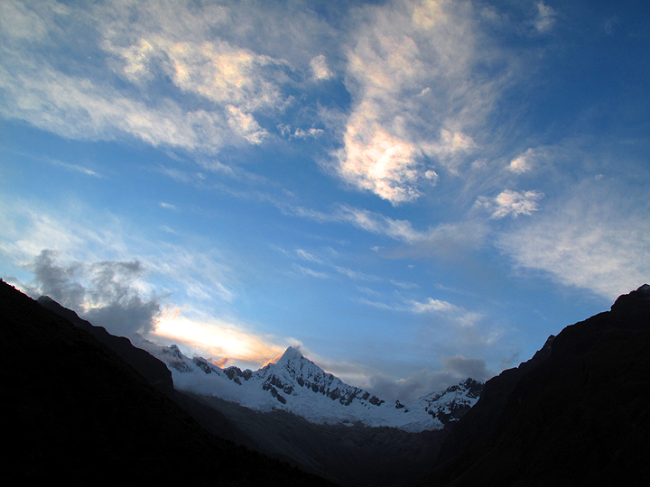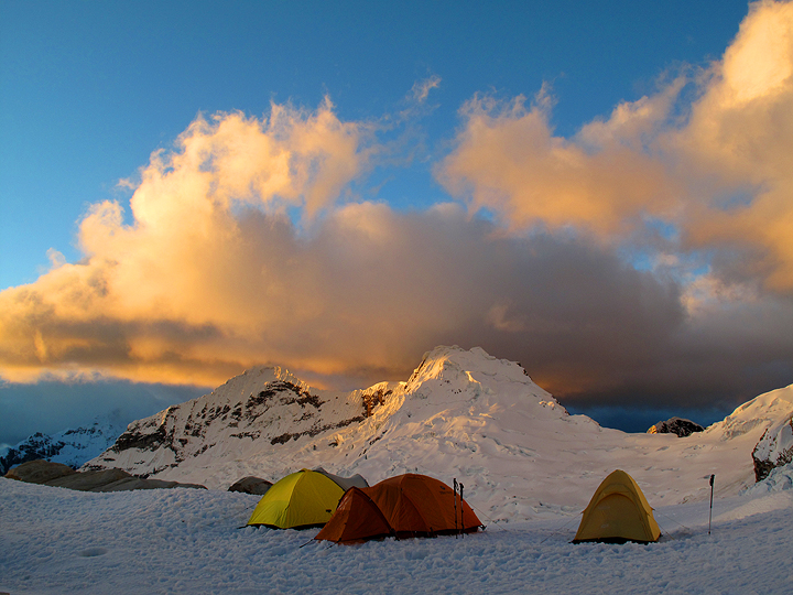 Tocllaraju high camp at about 5100 meters (16,730 feet) Sunset on the Aquilpo peaks in the background. |