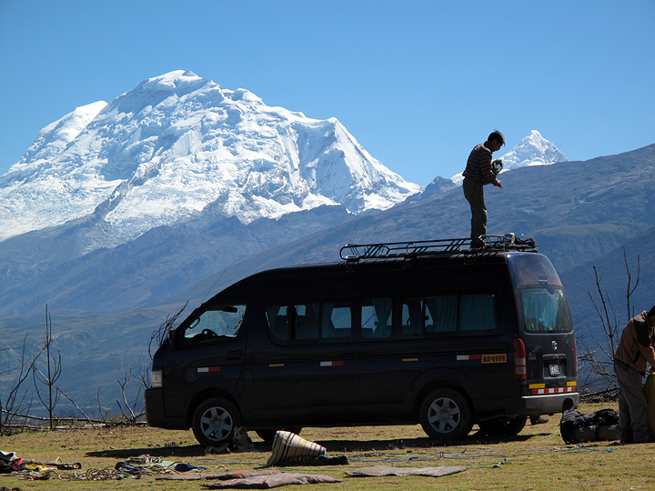 We spend one night in Huaraz, then continued into the Ishinca Base Camp. Here, we are unloading the van at Pashpa. Huascarán in the background. |