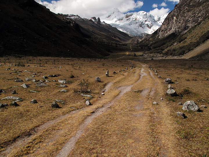 The trail into the Ishinca Valley. Our objective, Tocllaraju, is the pyramid in the background. |