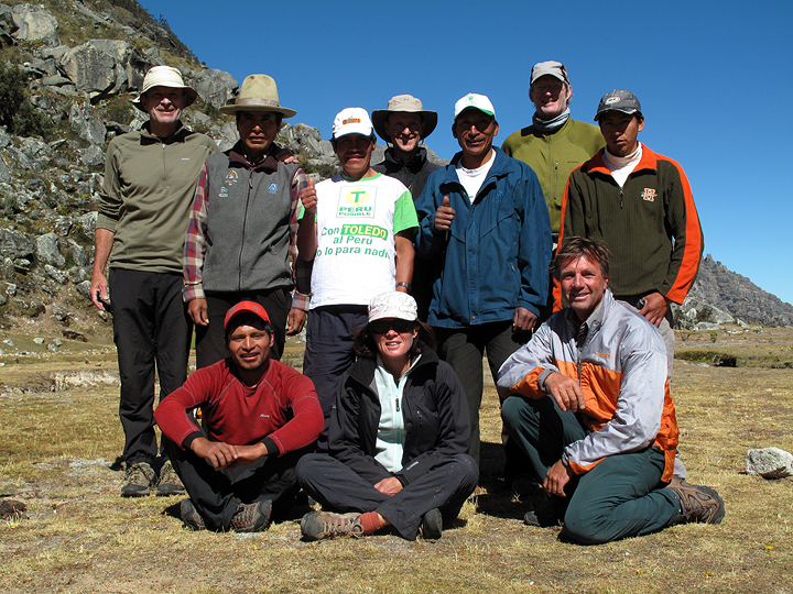 The crew at the Ishinca Base Camp. In the back, from left to right, are Emery Dameron (veteran of many trips with us, see the list above!), Emilio Alvarado (cook extraordinaire and head of Alvarado Adventures), Pablo (one of our three porters) Peter Staub (from New Zealand and husband to Lynne, in the center front), "El Cuerpo" (another one of our porters) Bill Clapp from Florida, and Evert (our third porter). In the front, left to right: Peter Alvarado (son of Emilio, and a UIAGM guide), Lynne (already introduced) and Mark (needing a shampoo). |