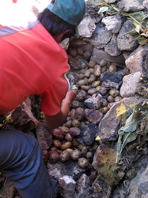 Pablo removes the cooked meat packages and potatoes from the pachamanca. |