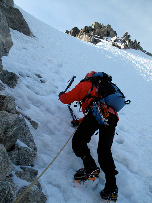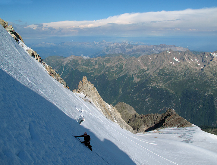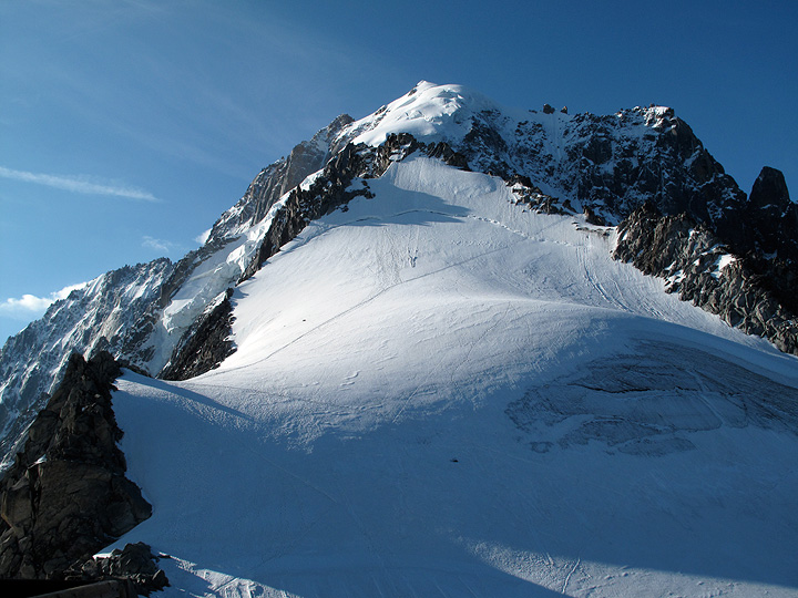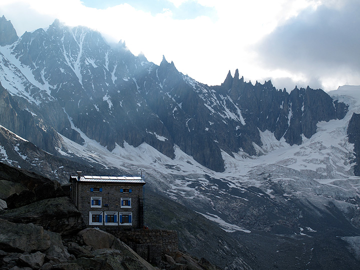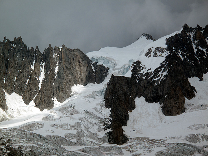 The forecast for days 3 and 4 were not too bad. We planned to climb Point Isabella, a snow and ice climb in the heart of the Mont Blanc Massif. This photo was taken on the approach to the Couvercle hut. The Tour Ronde (and location of a previous adventure of Norm's in July of 2007, is just left of center. |