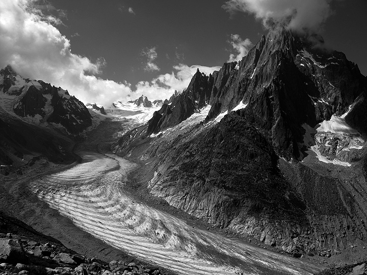 A view up the Mer de Glace from the Balcon trail. Les Grands Charmoz is the big peak on the right. |