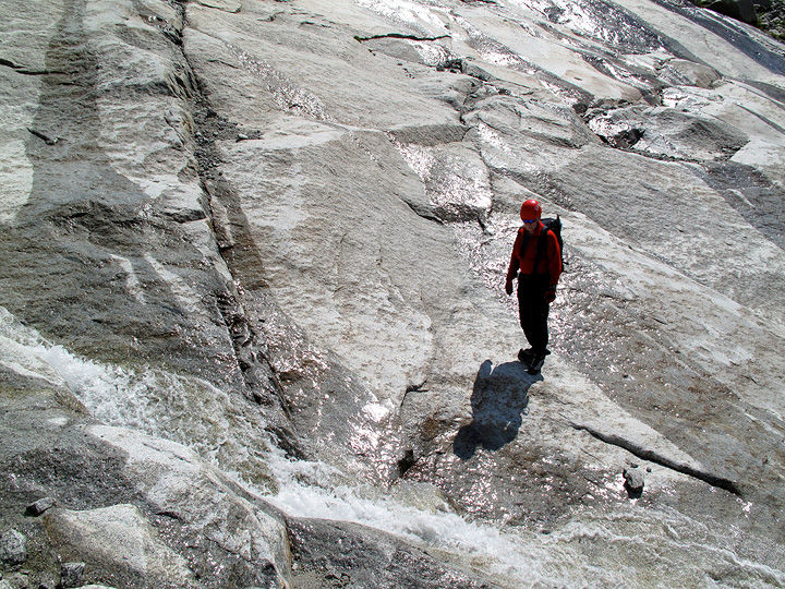 But Point Isabella was not to be. We woke up at 2:30, rain. And again at 5:00, more and harder rain. Not much to do but sleep in a bit more and hike out. We did have a nice walk out though, over the ladder-intensive Balcon route. Here, Norm traverses the bare rock slabs below the Charpoua Glacier. |