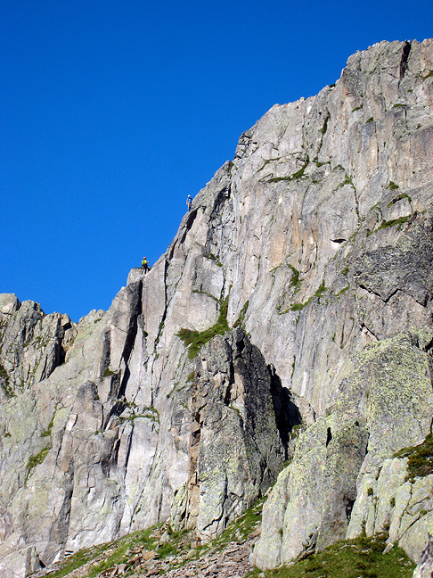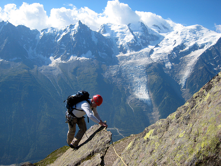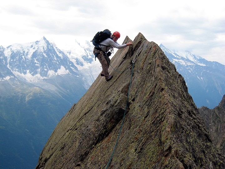 On our first day, we climbed the Chapelle de la Glière, a fun rock route in the Aiguilles Rouges. Luckily, we were virtually alone on the climb, as we had to race up the 12-pitch route to beat the ever threatening weather. On this pitch, the classic "Razor" it was actually raining very lightly. |