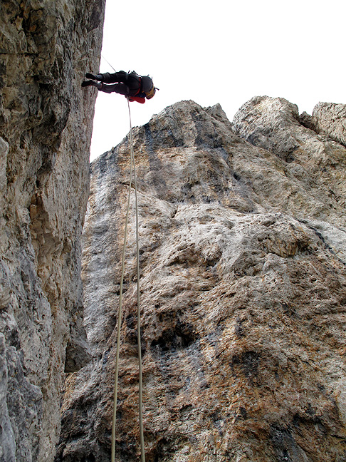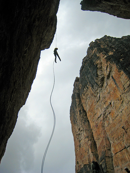 And one more outrageous rappel. Unfortunately, the rain began in earnest and were had to content ourselves with a short walk before heading down. |