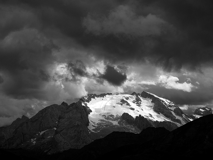 Looking back towards the Gran Vernel from Canazei. The new snow is a rare sight in July! |