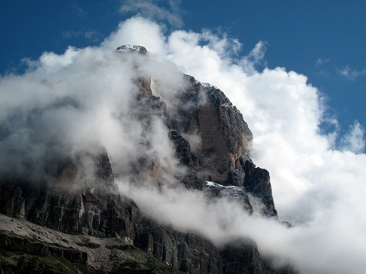 Michele and Craig, who have recently settled down near the shores of Lake Tahoe, joined Mark for six days in the Dolomites. Though the weather was anything except perhaps cooperative, we still did manage to climb for all but one of those days. Admittedly, we were chased down a couple of our descents by rain showers, but even so, once dry and warm again, they didn't seem so bad. |