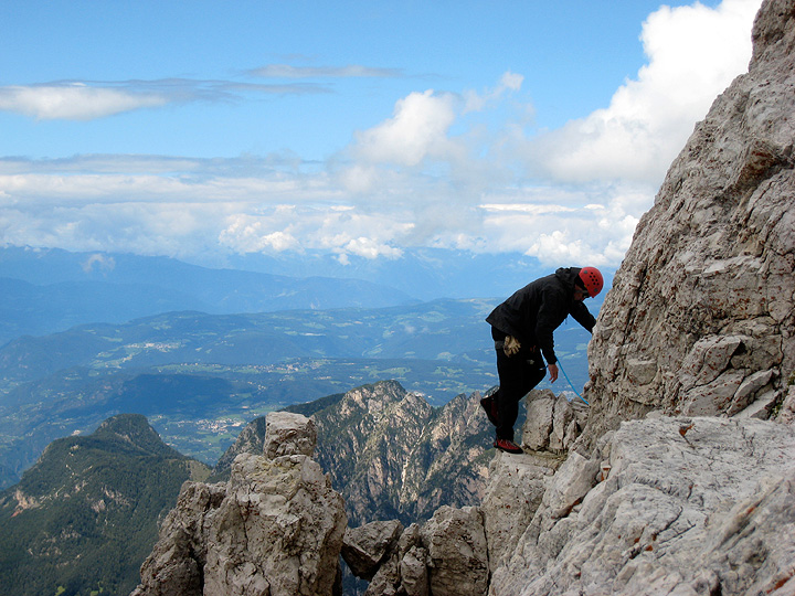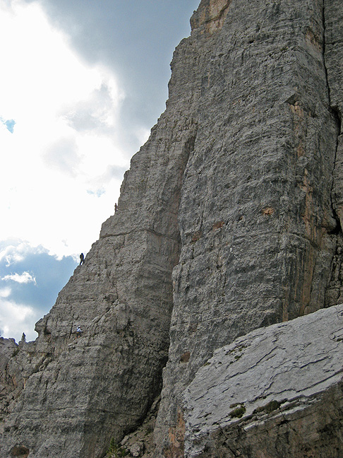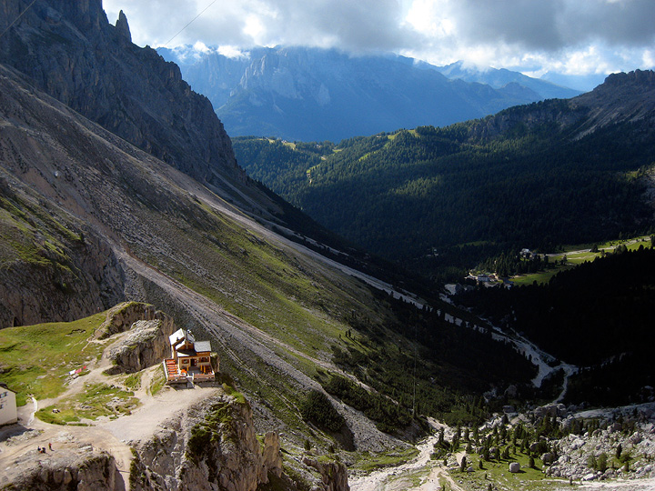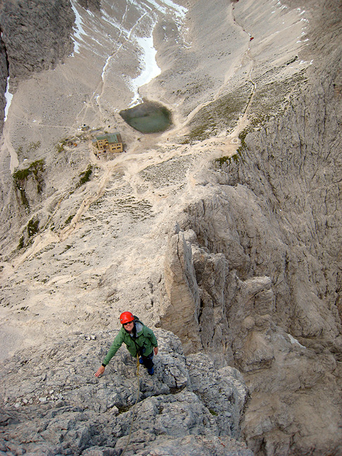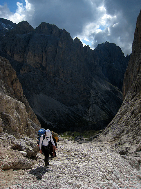 It is a bit of a walk to the base of the climb, but very scenic. Here, we are looking down on the Rifugio Preuss and the Val Gardeccia. |