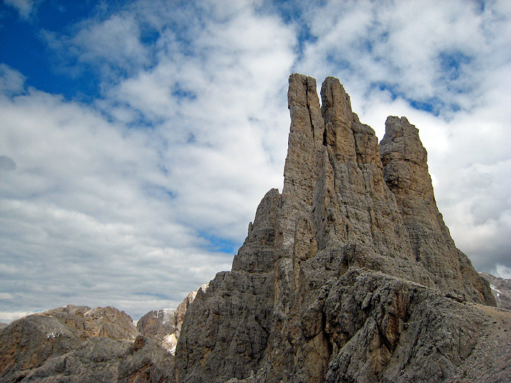 The weather forecast for our fifth day was the best of the week. We took advantage of it and climbed the ultra-classic Delagokante in the Vajolet Towers. Mouse over the see the outrageous line. |