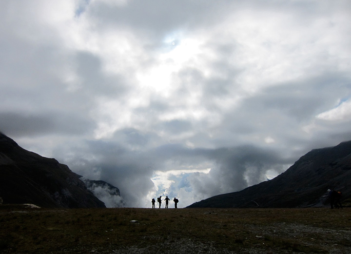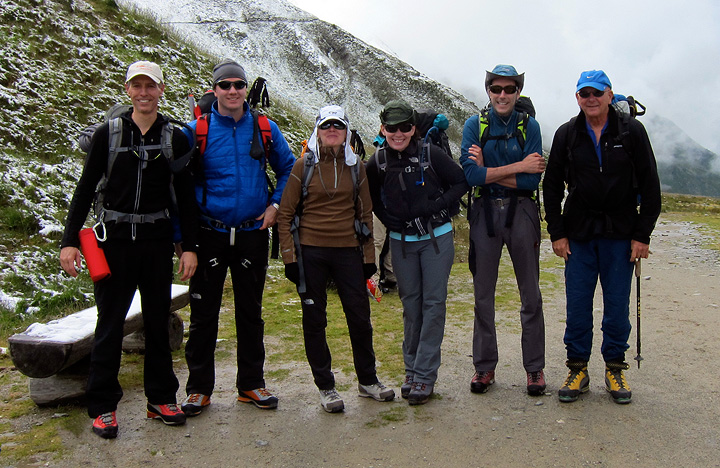 From left to right are Brian, Edouard, Anna, Molly, Paul, and Jan. As you can see, conditions were wintry for the start of our week. Snow fell to below 2700 meters the night before we began walking! |